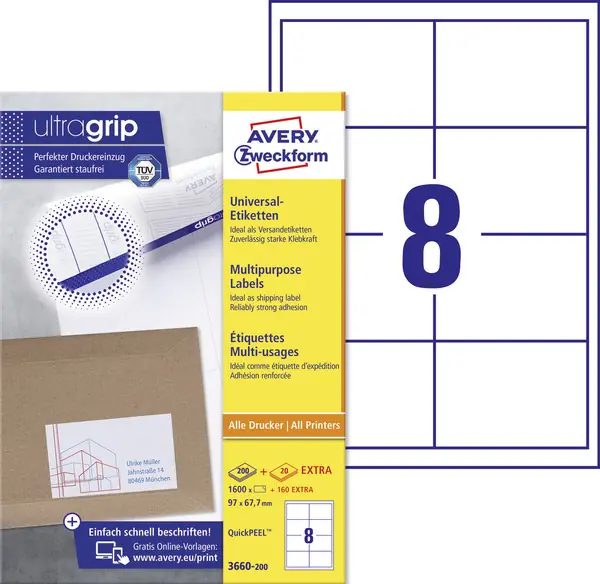 Die Universaletiketten aus dem Hause Avery Zweckform sind Allrounder und decken die verschiedensten Anwendungen flexibel ab: Perfekt als Adressetikett, zur Produktbeschriftung, fĂĽr die Beschriftung der BĂĽro-Ablage und Auszeichung in Lager und Produktion, zur Eigentumsbeschriftung, zur Beschilderung und und und – eigentlich ĂĽberall, wo eine Beschriftung gebraucht wird.