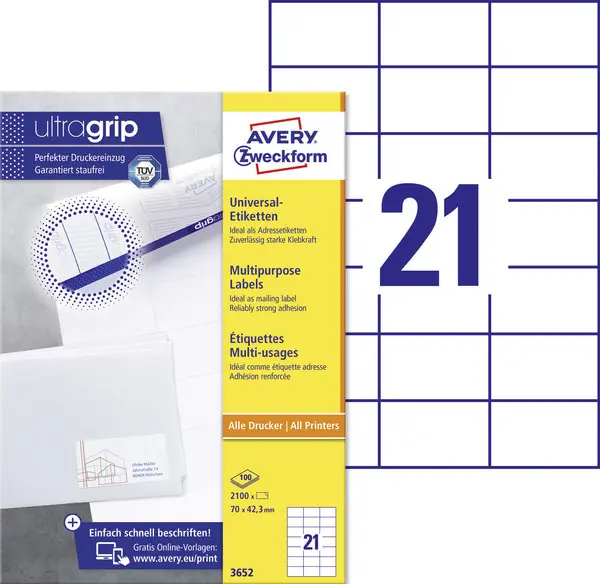 Die Universaletiketten aus dem Hause Avery Zweckform sind Allrounder und decken die verschiedensten Anwendungen flexibel ab: Perfekt als Adressetikett, zur Produktbeschriftung, fĂĽr die Beschriftung der BĂĽro-Ablage und Auszeichung in Lager und Produktion, zur Eigentumsbeschriftung, zur Beschilderung und und und – eigentlich ĂĽberall, wo eine Beschriftung gebraucht wird.