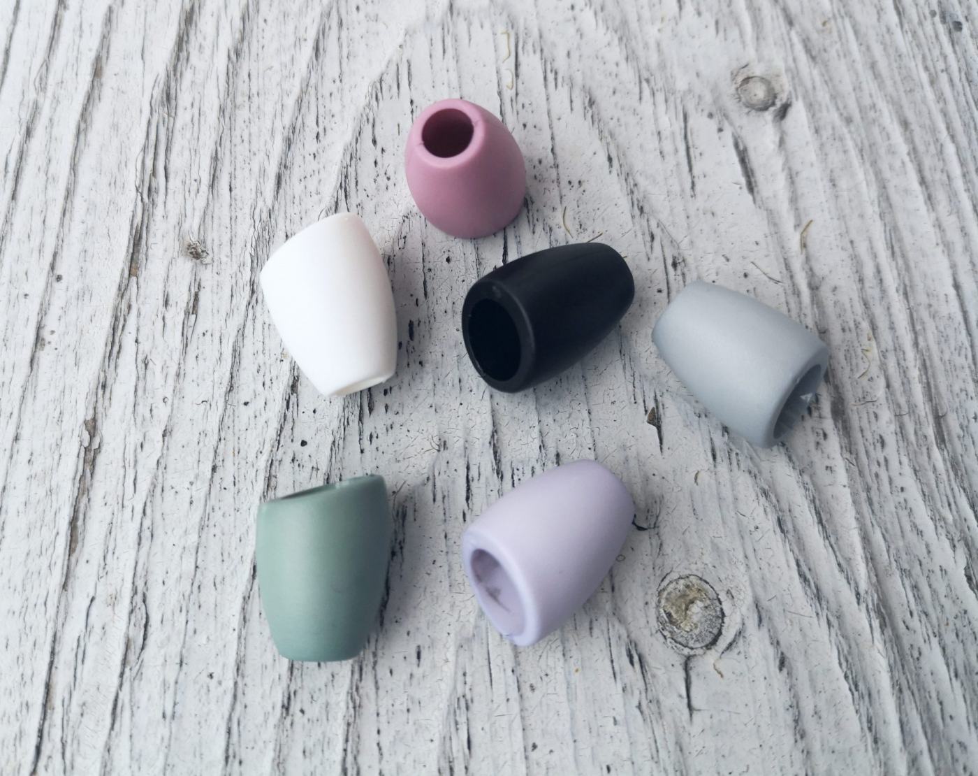2 Kordelenden mit 5mm Lochdurchmesser. Die Kordel wird durchgesteckt und verknotet. Dann wird das „Kordelende“ ĂĽber den Knoten gezogen!