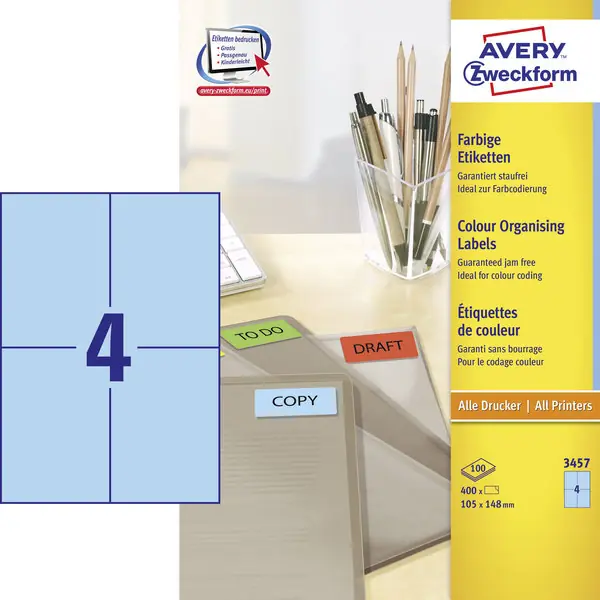 Die Universaletiketten aus dem Hause Avery Zweckform sind Allrounder und decken die verschiedensten Anwendungen flexibel ab: Perfekt als Adressetikett, zur Produktbeschriftung, fĂĽr die Beschriftung der BĂĽro-Ablage und Auszeichung in Lager und Produktion, zur Eigentumsbeschriftung, zur Beschilderung und und und – eigentlich ĂĽberall, wo eine Beschriftung gebraucht wird.