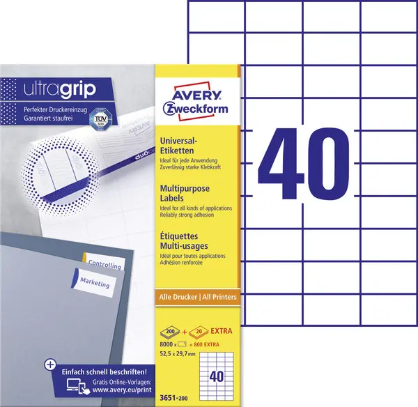 Die Universaletiketten aus dem Hause Avery Zweckform sind Allrounder und decken die verschiedensten Anwendungen flexibel ab: Perfekt als Adressetikett, zur Produktbeschriftung, fĂĽr die Beschriftung der BĂĽro-Ablage und Auszeichung in Lager und Produktion, zur Eigentumsbeschriftung, zur Beschilderung und und und – eigentlich ĂĽberall, wo eine Beschriftung gebraucht wird.