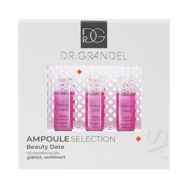 Start your beauty program with the Beauty Date ampoule from DR. GRANDEL. In no time a rosy-beautiful radiance that touches. The next date can come. The pink Beauty Date ampoule smoothes and relaxes expression lines and refines the complexion. Look forward to a quick beauty program. Skin Relax Peptide: Hexapeptide (short-chain protein building block) with a relaxing effect on facial expressions to smooth and significantly reduce expression lines. The alpine globe flower grows in the mountains of central and southern Europe. The extract stimulates the skin’s own defense system against negative environmental influences and thus helps the skin to protect itself. Skin impurities and redness are visibly reduced and inflammatory processes are significantly alleviated. Matysoft: Combination of an extract from the bark of the African tree Enantia chlorantha and oleanolic acid, for a balancing and refining effect and an even, fine complexion. DR. GRANDEL has been successfully developing and producing ampoules for more than 70 years. The advantages of the active ingredient concentrates in glass ampoules are obvious: concentrated effect and minimal product preservation with safe use.