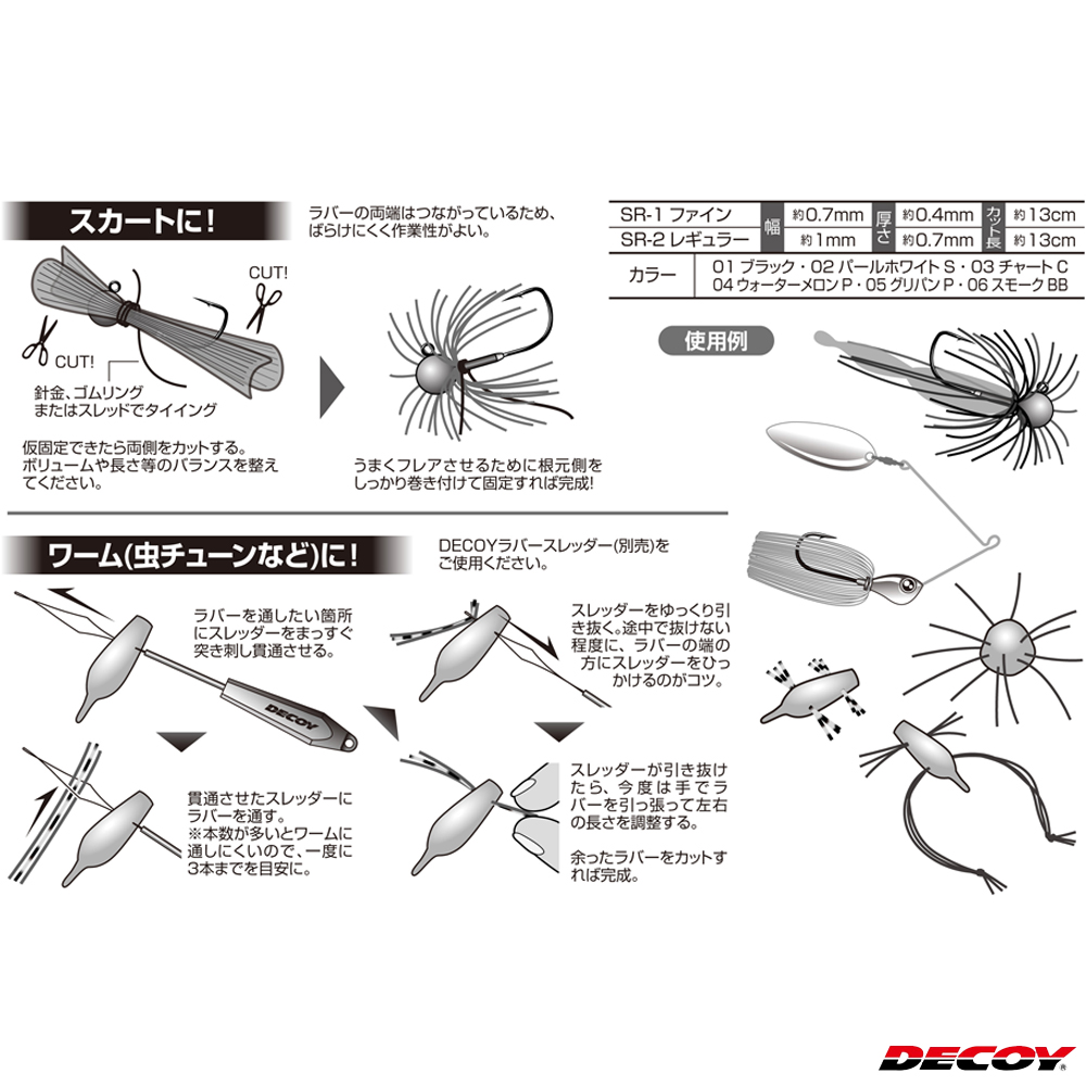 Manchmal beissen einem die Räuber die Silikonskirts vom Lieblingsköder ab oder man möchte einen einfachen Gummiköder tunen. Die Silicone Rubber Skirts der japanischen Firma Decoy sind die ideale Wahl dafür. Die Silikonfäden sind 13cm lang 1mm stark und werden in verschiedenen Farben angeboten. Passend dazu hat Decoy eine Einfädelhilfe, welche separat erhältlich ist, auf den Markt gebracht. In der Packung sind 3 Silikonstreifen enthalten.