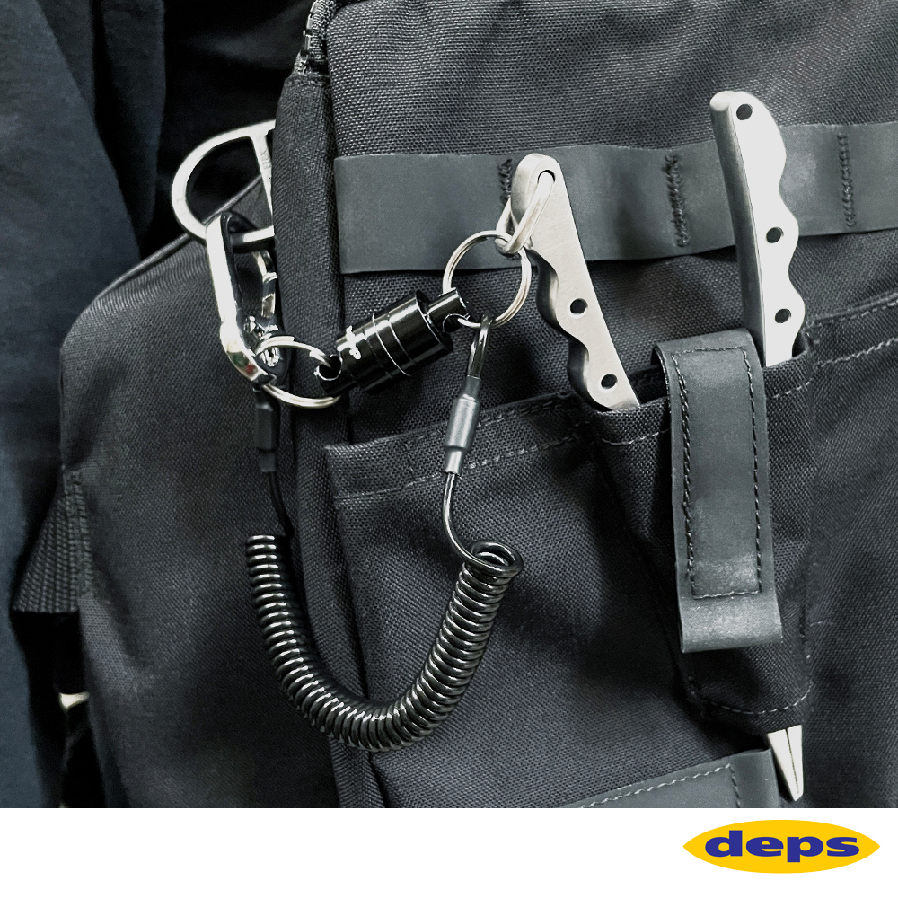 Die Spiralschnur, die den Karabiner und den Befestigungsring verbindet, verhindert den Verlust des befestigten Gegenstands, selbst wenn er versehentlich fallen gelassen wird.