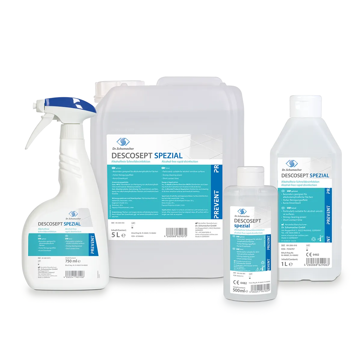 Zertifizierungen und Konformität: DESCOSEPT SPEZIAL ist gemäß DIN EN 13485, DIN EN ISO 9001, DIN EN ISO 14001 und BS OHSAS 18001 zertifiziert. Es wird nach einem validierten Umweltmanagementsystem hergestellt und entspricht den höchsten Qualitätsstandards.