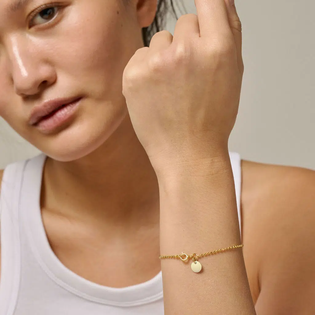 Das hochwertige Enamel Armband besteht aus reinem recyceltem Sterling Silber – welches mit 18 Karat vergoldet ist – und verfügt über einen emaillierten Anhänger. Es misst 17,5 cm und besteht statt der sonst üblichen Glieder aus kleinen Kugelelementen.