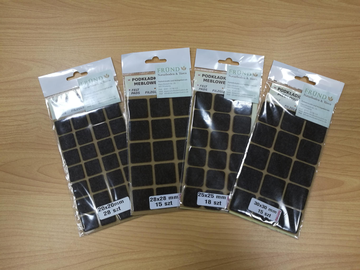 Filzgleiter quadratisch selbstklebend, auch als Möbelgleiter bekannt, bieten wir in vier Farben. Sie sind 3mm dick und in den Abmessungen 20×20, 25×25, 28×28 und 30x30mm verfĂĽgbar. Die Filzgleiter dienen dem Schutz von Parkett, Laminat, Vinylboden, Kork, Linoleum und Fliesen Oberflächen vor Kratzern, Abrieb oder Schrammen.