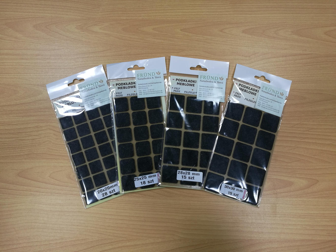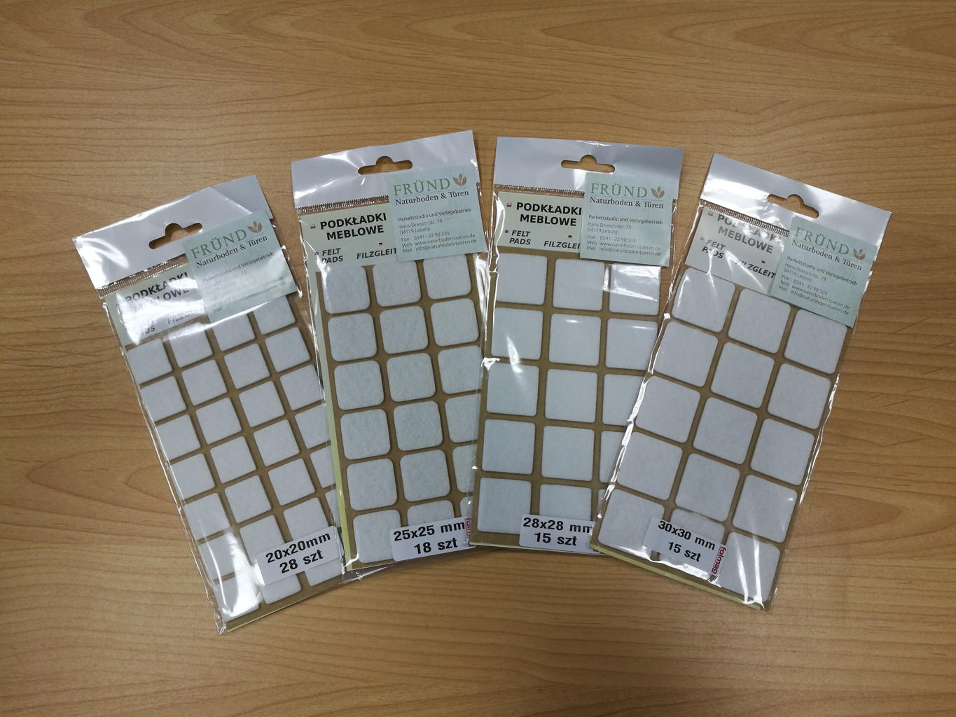 Unsere Filz Möbelgleiter sind auf einem Trägerpapier aufgeklebt und in Folie eingeschweißt. Sortiert nach Durchmesser enthalten die Päckchen: