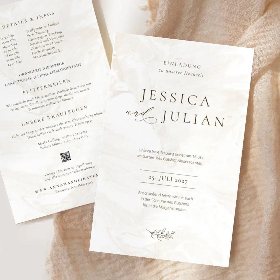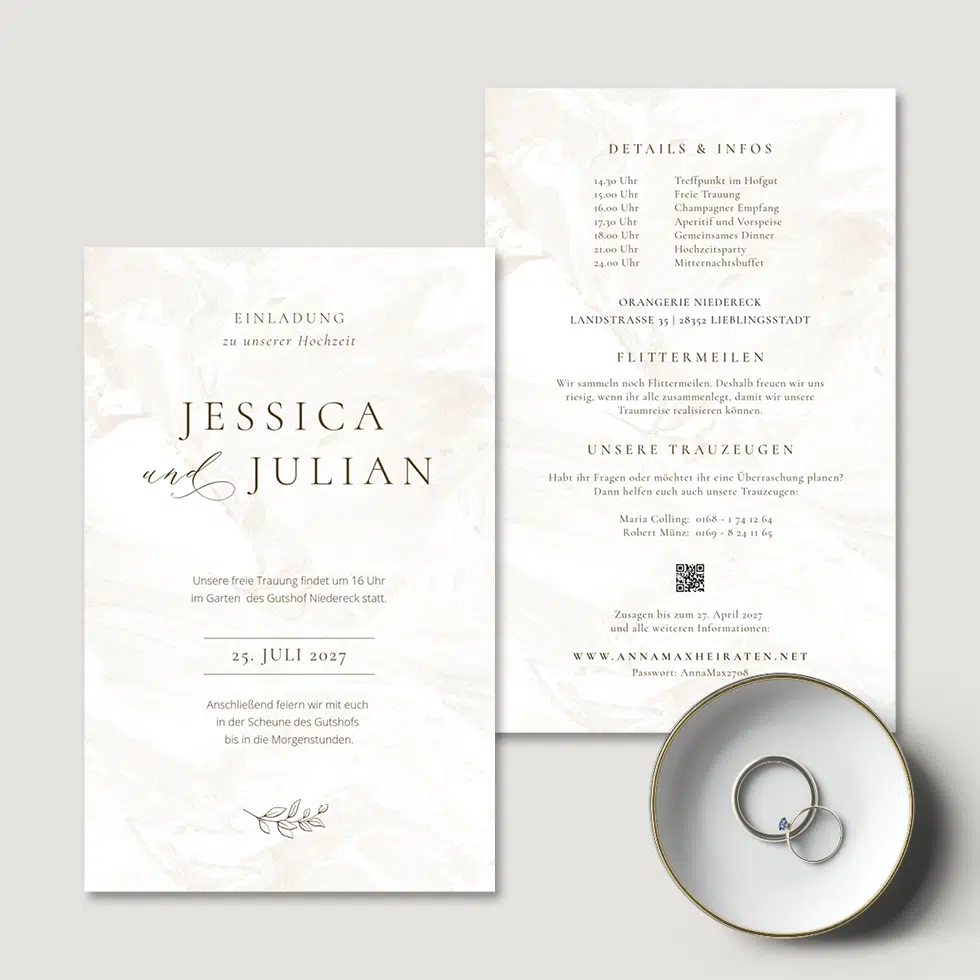 ✔︎ hochwertiger Qualitätsdruck – mit feinsten Details✔︎ exklusive Papiere in starker Grammatur✔︎ professioneller Layoutcheck✔︎ besondere Kartengröße für einen hochwertigen Look✔︎ Einladung einseitig oder zweiseitig gestalten✔︎ QR-Code zur Hochzeitswebsite ergänzen