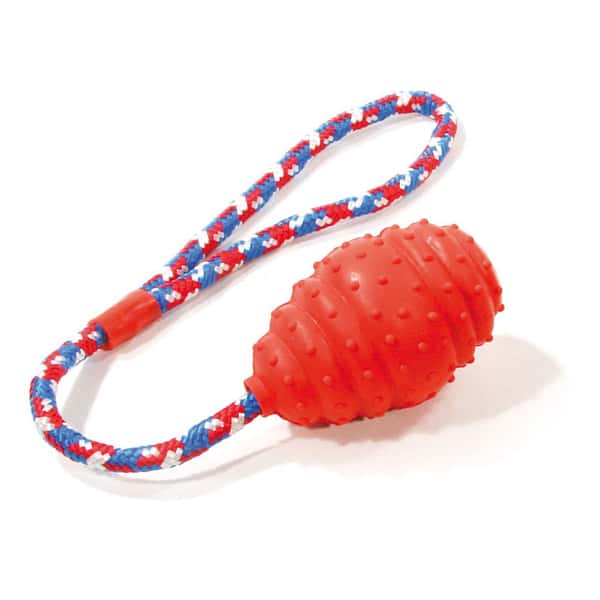 Spielzeug in Form eines Rugbyballs (mit Griff), fĂĽr Hunde geeignet und aus blauem Thermoplast hergestellt.