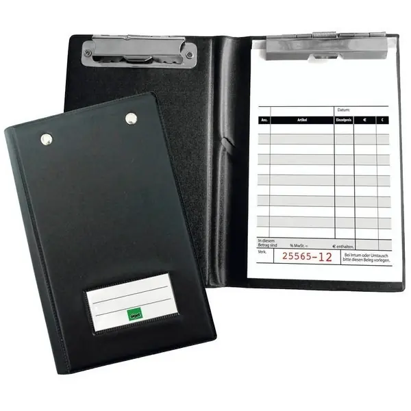 Sie wollen Ihren Kassenblock sicher und sauber aufbewahren? Dann greifen Sie am besten zu dieser Kassenblockmappe von SIGEL. Der schwarze Kunststoff präsentiert sich im Dauereinsatz als besonders robust und mit einer zusätzlichen Metallklemme als wahres Organisationstalent, wenn Sie auf die Schnelle ein Rechnungsblatt ausfĂĽllen möchten. Die Klemmbrettmappe fasst problemlos einen Kassenblock mit 2×50 Blatt. Die in der Kassenblockmappe zusätzlich integrierte Metallklemme erweist sich als besonders praktisch bei der Abheftung des Additionsblattes. Dank des Stiftehalters haben Sie Ihren Stift auĂźerdem immer griffbereit. So sind Sie perfekt ausgestattet und organisiert, wenn Sie mal wieder eine handschriftliche Rechnung erstellen mĂĽssen. Die Klemmbrettmappen mit den MaĂźen 12,0 x 18,0 cm (BxH) kann gleichzeitig als Unterlage zum AusfĂĽllen der Rechnung verwendet werden. AuĂźen befindet sich zudem ein Klarsichtfenster fĂĽr eine individuelle Beschriftung. Kaufen Sie ihre Klemmmappen gĂĽnstig bei Oerter!
