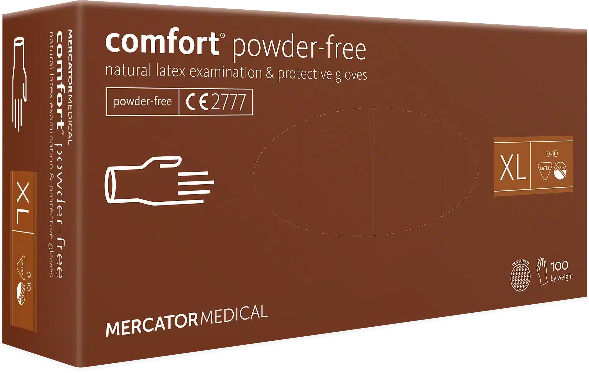 comfort powder free – sind diagnostische puderfreie Latexhandschuhe. Dank der puderfreien Innenfläche lassen sich die Handschuhe auch bei nassen Händen leicht anziehen. Die puderfreien Comfort -Handschuhe haben eine Textur, die einen sicheren Halt gewährleistet – auch in öligen oder nassen Umgebungen. Flexibler Latex passt sich der Hand an, wodurch die Handschuhe sehr bequem sind und die Fingerbewegungen nicht einschränken. comfort puderfrei sind Handschuhe mit einem breiten Anwendungsspektrum.