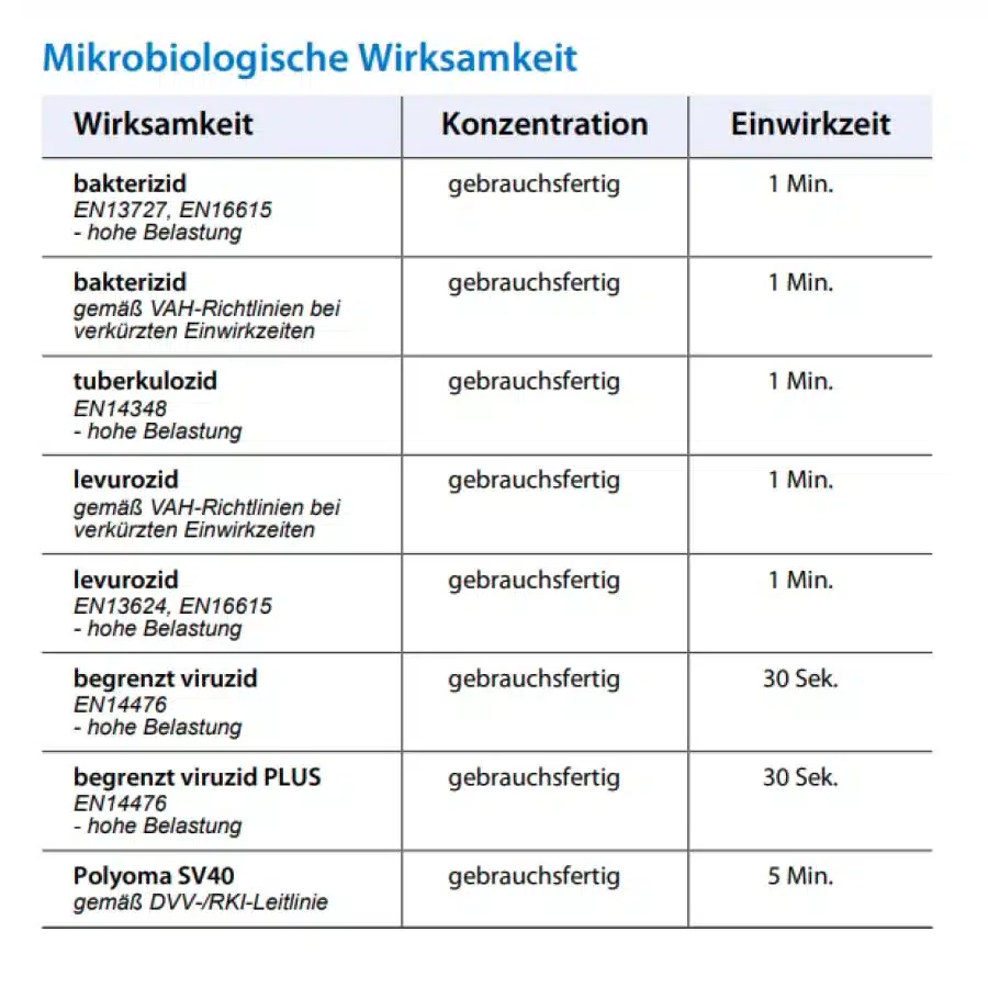 - Bakterizid (1 Min.) – nach VAH-Richtlinien & EN 13727