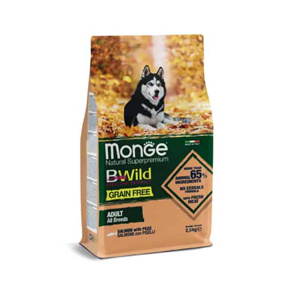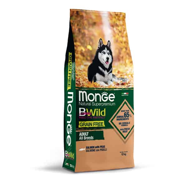 Monge Bwild Grain Free Dry Food Getreidefreies Trockenfutter Lachs und Erbsen fĂĽr ausgewachsene Hunde.
