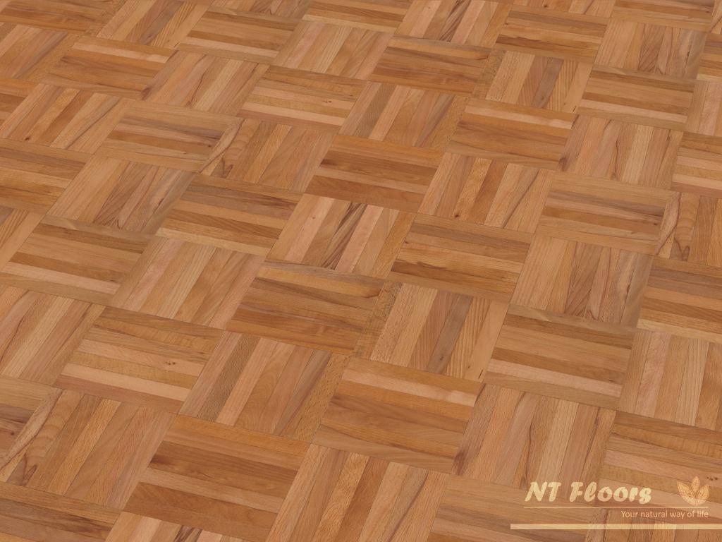 NT Floors Mosaikparkett Buche gedämpft ist mit 8mm Stärke das dünnste Massivparkett. Da die Parkett Stäbe zu unterschiedlichen Mustern zusammengefasst sind, ist Mosaikparkett auch unter dem Begriff Musterboden bekannt. Die Parkettstäbe sind massiv ausgeführt und seitlich nicht profiliert. Dadurch steht nahezu die gesamte Dicke des Parkettbodens als Nutzschicht zur Verfügung. Insofern ist die Frage nach der mehrfachen Schleifbarkeit schnell mit „Ja“ beantwortet.
