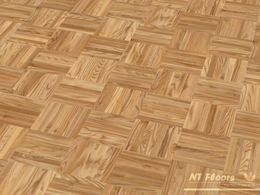 NT Floors Mosaikparkett Esche ist mit 8mm Stärke das dünnste Massivparkett. Da die Parkett Stäbe zu unterschiedlichen Mustern zusammengefasst sind, ist Mosaikparkett auch unter dem Begriff Musterboden bekannt. Die Parkettstäbe sind massiv ausgeführt und seitlich nicht profiliert. Dadurch steht nahezu die gesamte Dicke des Parkettbodens als Nutzschicht zur Verfügung. Insofern ist die Frage nach der mehrfachen Schleifbarkeit schnell mit „Ja“ beantwortet.