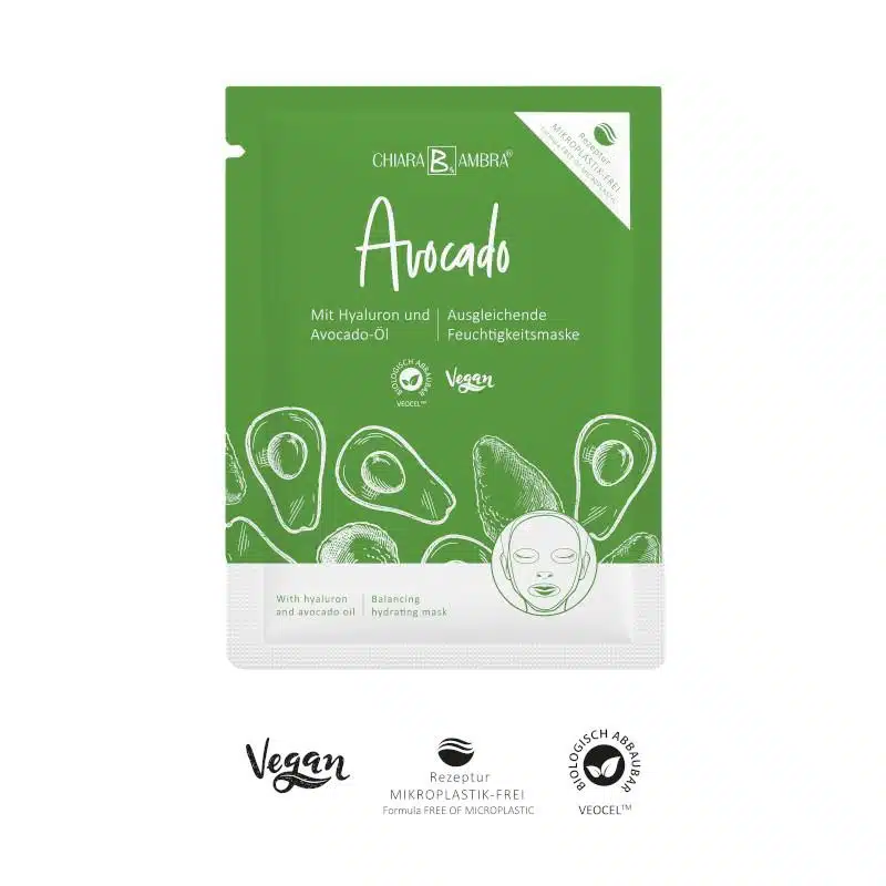 The sheet mask with avocado oil and hyaluron noticeably pampers your skin and provides it with intensive moisture and valuable active ingredients. For a silky-soft skin feeling. With its silky soft surface, the sheet mask nestles gently against every facial contour and thus ensures that the skin absorbs the active ingredients optimally.