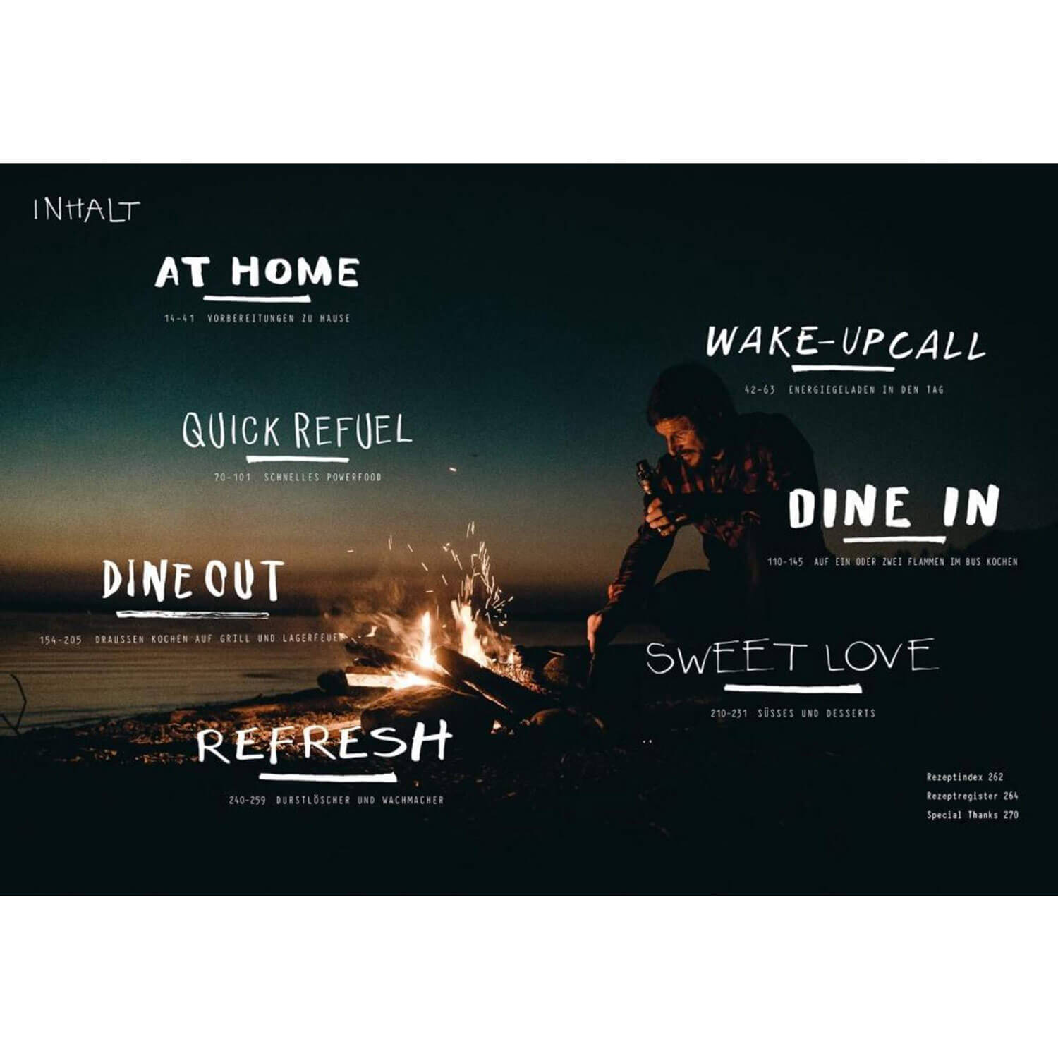 DAS Camping-Kochbuch fĂĽr den perfekten Outdoor-Genuss: Egal ob in den Bergen oder am Meer, ob unterwegs mit Zelt oder VW-Bus; egal ob fĂĽr Alleinreisende, fĂĽr Freunde oder die komplette Crew, die ihr nach dem Surfen auf dem Parkplatz getroffen habt – die 120 genialen Camping-Rezepte wie Power-Frittata, Turbo-Carbonara oder Bacon-Cheeseburger fĂĽllen eure Akkus unterwegs wieder auf. Die Rezepte sind lecker und abwechslungsreich – und natĂĽrlich optimiert fĂĽr die Outdoor- und CampingkĂĽche. Worauf wartet ihr noch?
